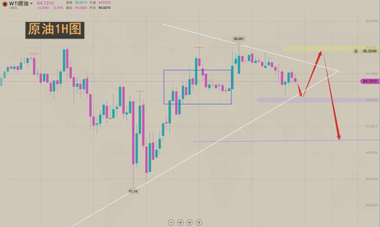 原油现在属于波段见顶后的顶部震荡,当前走下跌段,下方63支撑非常重要,此位置上,原油属于上涨后的顶部震荡,但破位的情况下,原油将会开启下跌走势,下方的支撑则是59一线。无论何种情况,现在原油是明显的下跌波段,亚盘65上或者附近还是继续空,下看63支撑。