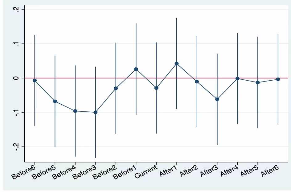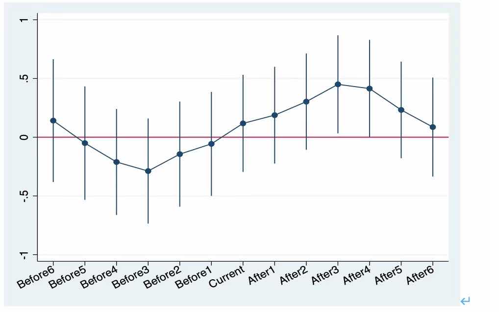 做的国家政策效应分析,包括对中国企业的促进效应(基准回归显著)以及对东道国的不良影响效应(基准回归不显著),回归结果满足预期。平行趋势图分别如下,请教一下满不满足平行趋势趋势呢