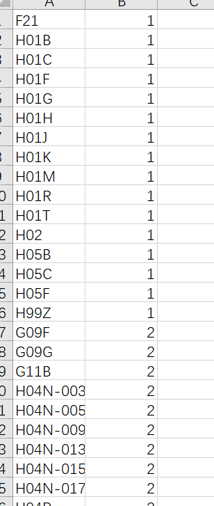 第一张图匹配第二张图的第一列,得到第二列的数值,第一张图的代码是全一些的,比如说只要满足F21开头的,就为1,谢谢大家啦