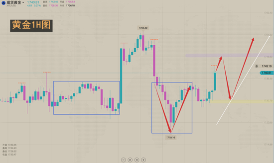 黄金4小时走势上看,最近两次的深度回踩,均是在50日均线附近获得支撑,虽然最近大阴走势较多,但是没有一次延续,而多头则是每次慢涨诱空。昨日下跌至1719一线后反弹,今日延续,并且突破今日亚盘的1736压力,错了就是错了,一切以实际走势为准。