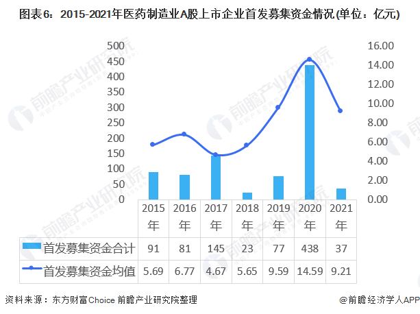 从首发募集资金来看,2015-2020年,医药制造业A股上市企业平均首发募集资金呈现明显的波动增长态势。2020年,医药制造业A股上市企业首发募集资金合计达到438亿元,超过2015-2019年五年的总和,其首发募集资金均值达到了14.6亿元,较2019年增长约52%。