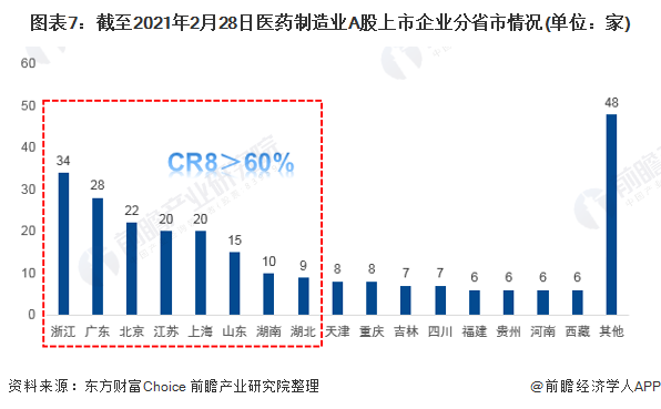 截至2021年2月28日,260家医药制造业A股上市企业主要分布在浙江、广东、北京、江苏、上海等地,其中浙江与广东分布数量最多,分别为34家和28家,分别占到了医药制造业A股上市企业总数的13.08%和10.77%。综合来看,我国医药制造业A股上市企业地域集中度较高,CR8超过了60%。