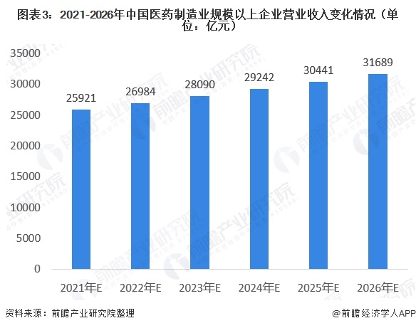 据此,前瞻产业研究院初步估计,2021-2026年,医药制造业营业收入将不断增长,到2026年中国规模以上医药制造企业营业收入或将达到3.17万亿元左右。