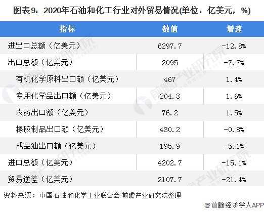 2020年,石油和化工行业规模以上企业工业增加值比上年增长2.2%;营业收入11.08万亿元,下降8.7%;利润总额5155.5亿元,下降13.5%;进出口总额6297.7亿美元,下降12.8%;全国油气总产量3.32亿吨(油当量),增长5%;原油加工量6.74亿吨,增长3%;主要化学品总产量增长约3.6%。