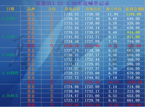 周一亚盘黛清1742通知学员进场空单,在1730位置手动止盈出局。欧盘1730通知学员进场空单,在1737位置手动止盈出局。美盘通知学员1733顺势进场多单,在1738位置手动止盈出局。