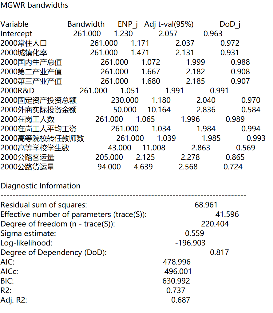 最近在写毕业论文,用到了多尺度地理加权回归模型(MGWR),分析结果如下。我看了相关论文还有网上的教程,论文里关于是否通过显著性检验都是一笔带过,网上的教程(https://www.pianshen.com/article/29841972648/)里面讲了结果各个指标的意义,但是他里面说DoD(Degree of dependency)是自由度,可是自由度不是df吗?而且自由度应该也不会是零点几的小数吧。然后它里面又说“每个变量有自己的t统计量标准,不一定是和1.96相比”,我就更不明白了,到底是要拿哪个自由度来确定t值表中的位置,再拿哪个t值和对应的值比来检测是否通过了显著性假设啊。