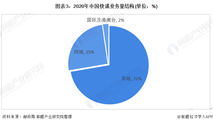 2020年我国快递业务量主要以异地为主,异地快递业务量占总业务量比重达72%;同城快递业务量占总业务量比重为25%,港澳台快递业务量占总业务量比重为2%。