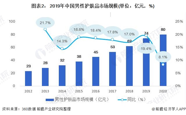 360数据显示,2018年我国男性护肤品市场规模为62亿元,同比增长17.0%,增速快于女性护肤品市场规模增速,前瞻认为,2020年受疫情影响,中国男性护肤品市场规模增速将有小幅下滑,市场规模将达80亿元,同比增长8.11%。