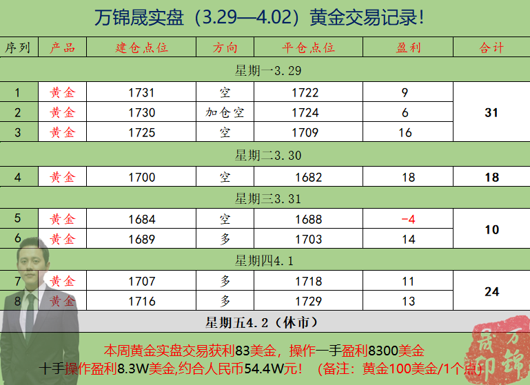 本周黄金市场因复活节周五休市一天,虽然实际交易日只有四天,但是行情非常给力。面对这样的行情你操作的怎么样?利润拿到了多少?震荡行情不破不立,破位必有大行情,大跌大涨之下每天都是好行情,我们一共操作8单,亏损一单,共获利83美金,平均一单的利润在10美金,时间虽然少了一天利润可一点没减少!