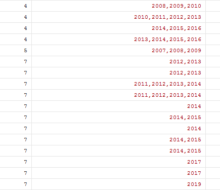 如图所示,我如何把stkcd为4、5、7的ViolationYear 的年度合并在一起。我想得到的数据,就是如下图。