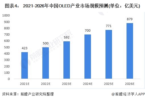 据预测,2021年,我国OLED产业市场规模为423亿美元,预计未来,OLED行业市场规模还将继续高速增长,到2026年,这一市场将增长到879亿美元,成为未来显示世界的主力军。