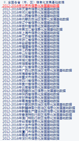 2012-2016年全国各省市信息化发展基础数据,从2017年《中国信息年鉴》上导出来的数据,全部为Excel版本,数据清单如下: