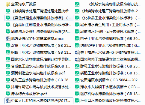 一些水处理方面的标准、文件、导则等等。包括《城镇污水处理厂污染物排放标准-2015》(征求意见稿)、城镇污水处理厂污染物排放标准(GB18918-2002)、污水排入城镇下水道水质标准(GB-T-31962-2015)、污水综合排放标准、排污许可证申请与核发技术规范水处理(试行)(HJ 978-2018)、城市污水再生利用+工业用水水质(GBT+19923-2005+)等