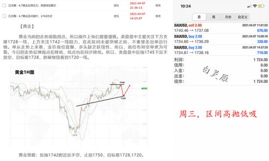 回顾周三,行情区间震荡,笔者在文中也给出明确提示。共盈利三单,40空,34多,高抛低吸。跟对了人,轻松赚钱。周三共盈利1700美元。