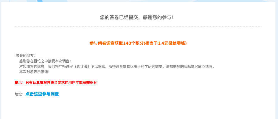 关于外卖满意度和影响因素的调查问卷--问卷填写完成页面 https: // 3w.wjx.cn/wjx/join/complete.aspx?activityid=112507436&joinid=109017090927&sojumpindex=223&tvd=Pkx0%2bl7v6uw%3d&comsign=3B7CC89E296A5C72C8F63A3E7B67134EDDD5878C&s=&sa=26&ea=30&ge=2