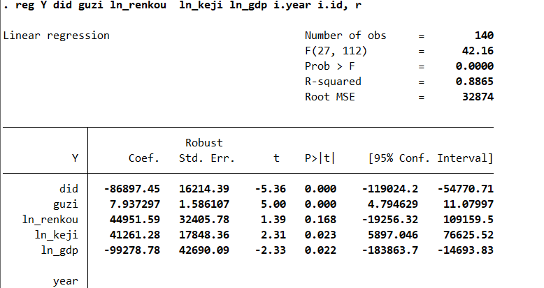 请大神帮忙看一下双重差分did的结果,谢谢!!+~~