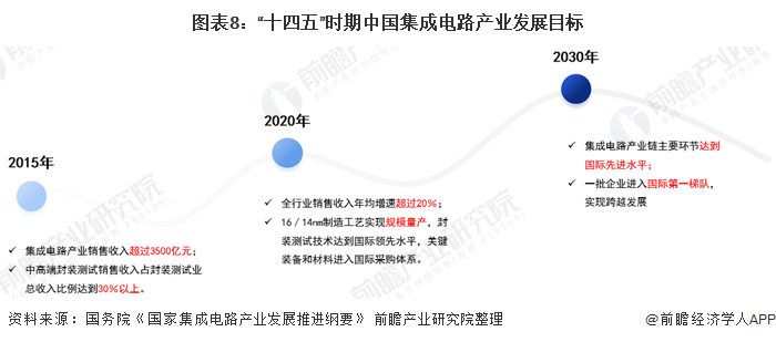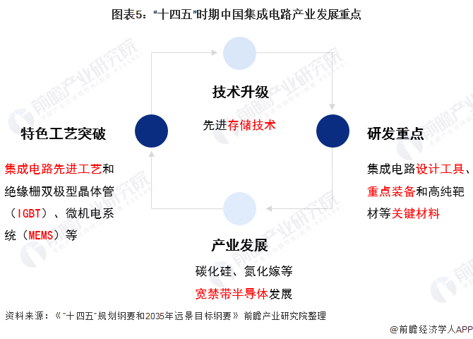 根据《“十四五”规划纲要和2035年远景目标纲要》,“十四五”期间,我国集成电路产业将围绕技术升级、工艺突破、产业发展和设备材料研发四个方面重点发展: