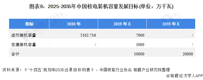 此外,根据中国核能行业协会发布的《中国核能年度发展与展望(2020)》中的预测数据显示,到2025年,我国在运核电装机达到7000万千瓦,在建3000万千瓦;到2035年,在运和在建核电装机容量合计将达到2亿千瓦;核电建设有望按照每年6至8台机组稳步推进。