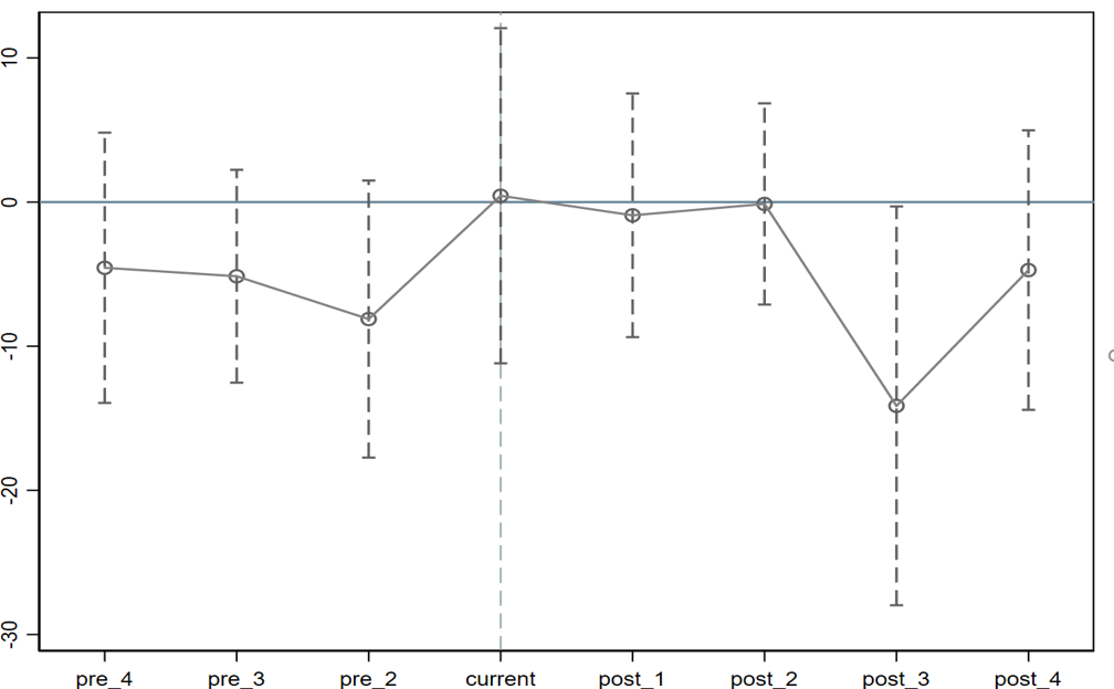 只知智 发表于 2021-4-23 16:54 你这个政策发生后的95%置信区间大都包含了0,不满足平行趋势。 正常应该是政策发生后各期效应全部或大多数 ...