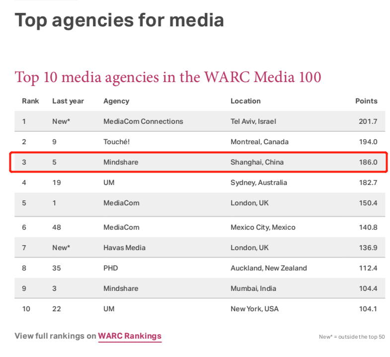 传立在WARC Media 100最佳媒介代理商排行榜单中,传立中国在全球媒介代理商排名中荣获第三名。也由于传立中国的出色表现,中国市场在WARC Media 100排名大幅上升。因此,本文章在媒介代理公司方面,将主要针对传立中国公司进行分析探讨。