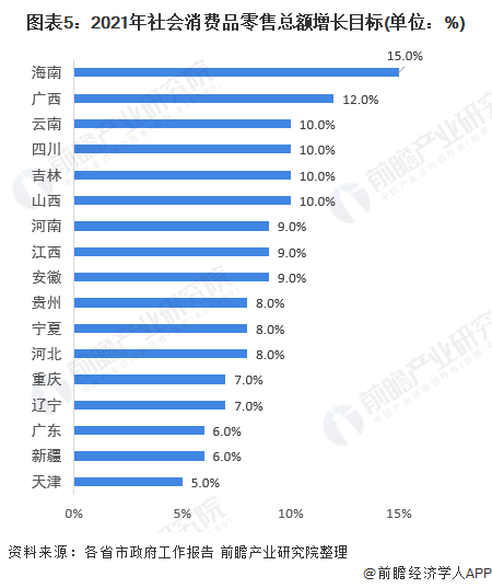 社会消费品零售总额可以反应一定时期人民物质文化水平的发展情况,也是地区人民物质文化生活富足的重要指标体现,故此在2021年政府工作报告中,多地披露了该指标。目标中,海南、广西、云南、四川、吉林、山西社会消费品零售总额目标均超过10%,海南省最高为15%。