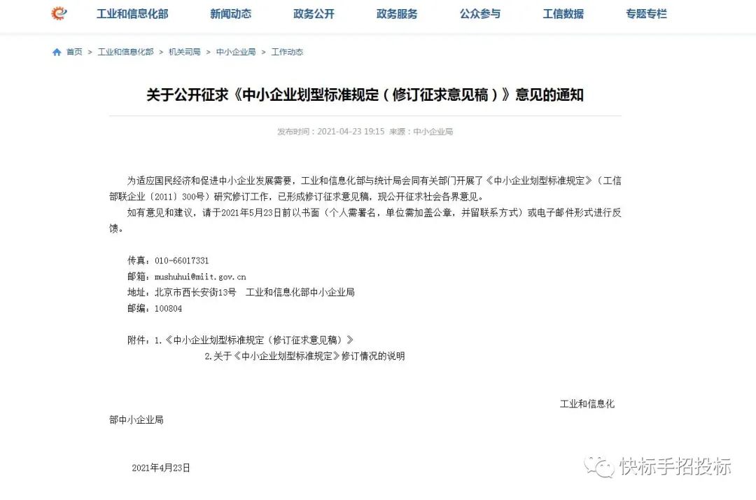 为适应国民经济和促进中小企业发展需要,近日,工业和信息化部中小企业局发布关于公开征求《中小企业划型标准规定(修订征求意见稿)》意见的通知,向社会各界公开征求意见。
