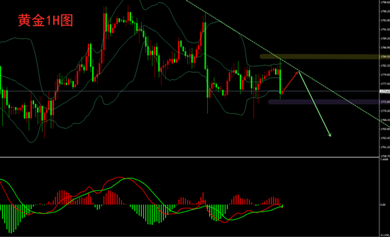 黄金昨日维持1768-1783区间内震荡,上不破压力,下没有跌破支撑,短线继续区间内运行,当前的震荡属于下跌后的盘整,依旧是空头跌势,所以今日亚盘1785压力位置下还是继续做空。
