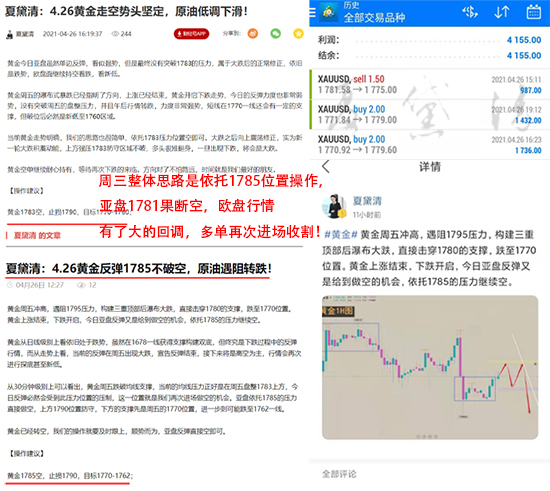 周一黄金亚欧盘一直维持窄幅震荡,美盘最终迎来大的下跌,黛清文章中强调1785不破就是空,空单不负所望,如期下跌收割!