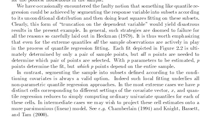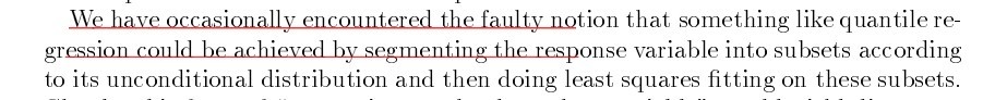 We have occasionally encountered the faulty notion that something like quantile regression could be achieved by segmenting the response variable into subsets according to its unconditional distribution and then doing least squares fitting on these subsets. Clearly, this form of "