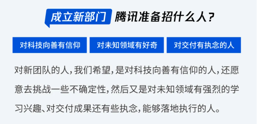 “可持续社会价值事业部”的成立,是腾讯的机遇,需要一大批的具有相关思维、能力的人才。在《腾讯战略升级,成立新部门,这些岗位不能错过》一文中,腾讯也提出了自己的人才需求。