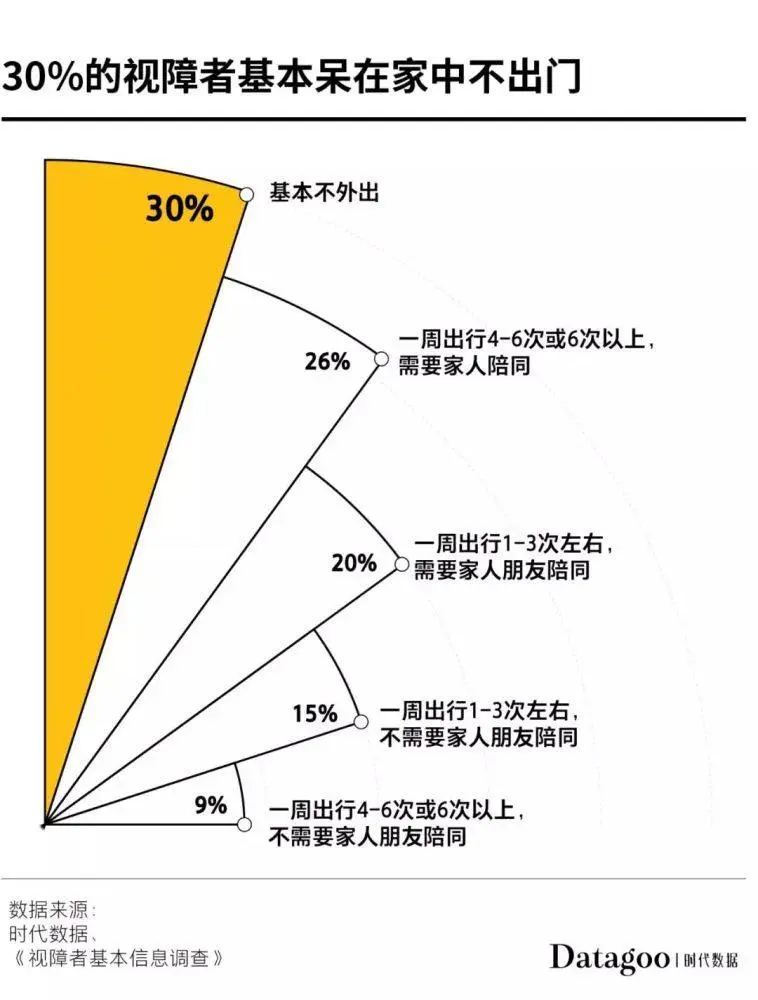 据世界卫生组织2010的统计数据显示,在中国,视障人士共有824.8万,而2016年,视障人数的数量已经迅速增长到了1731万人,也就是说,每八十个人中,大约就有一名失明人士。但是如此庞大的群体,为什么我们在生活中却极少见到他们?我的理由分析如下: