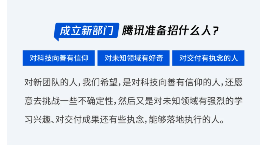 - 由腾讯战略升级,成立新部门,这些岗位不能错过。为了落地“可持续社会价值创新”,腾讯拟招聘以下岗位:后台开发工程师、数字化方案解决架构师、产品经理、产品运营经理、K15学校生态高级合作经理、高级品牌经理......