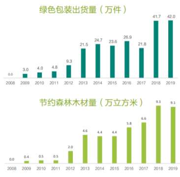 2019年,华为全年绿色包装出货量达40多万件,相当于节约了90000多立方米的森林木材。