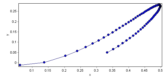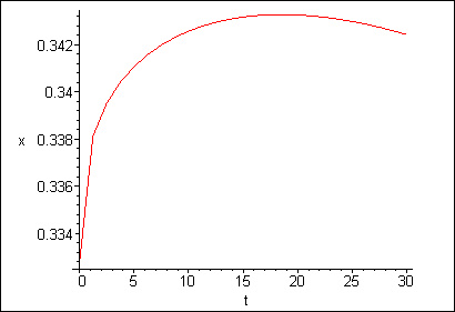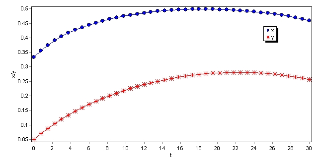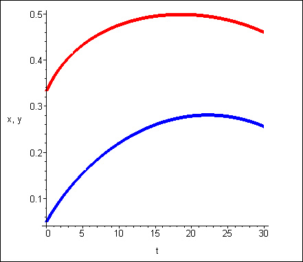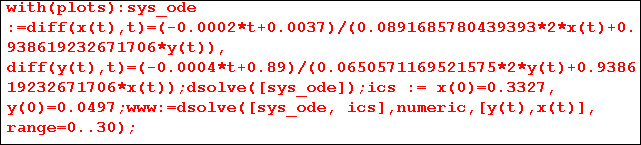 >> [x,y]=dsolve('-0.0002t+0.0037=(0.0891685780439393*2*x+0.938619232671706*y)*(dx/dt)','-0.0004t+0.0089=(0.0650571169521575*2*y+0.938619232671706*x)*(dy/dt)','x(0)=0.3327','y(0)=0.0497')