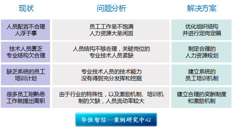 从该公园的人员结构和员工队伍建设中不难看出,虽然在人力资源开发方面做了不少工作,但是由于缺少规划、培养、使用和管理的有序步骤,使得人力资源开发和管理力度不够,造成了人力资源闲置和人员结构不合理的现象。基于对现状问题的深入分析,华恒智信顾问团队提出以下解决方案: