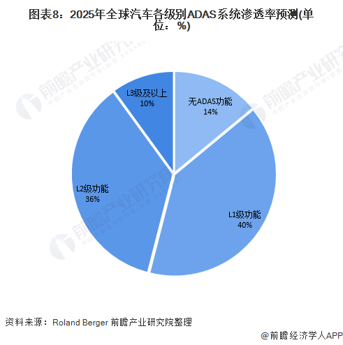 据罗兰贝格(Roland Berger)公司的预测显示,至2025年,在全球范围内,预计到2025年全球14%的车辆无ADAS功能,40%的车辆具有L1级功能,36%的车辆具有L2级功能,10%的车辆具有L3级或更高功能。