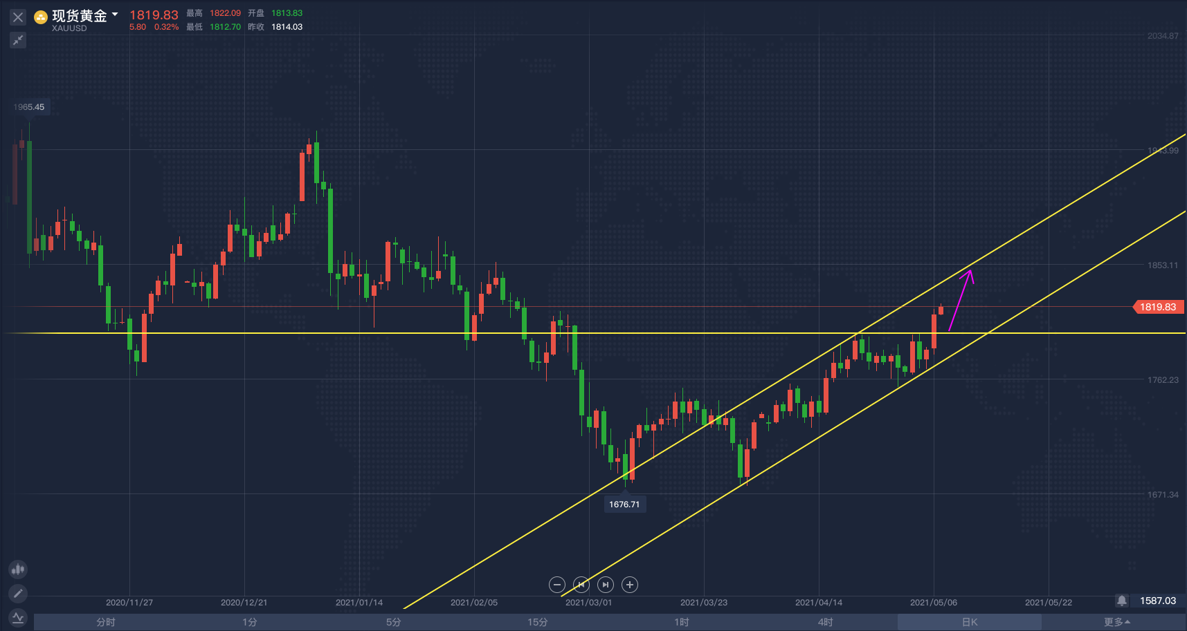 今日盘面直接看技术面走势,行情依旧强势,基本上没有什么回调的信号,目前最高到了1822价位已突破隔夜最高点,行情将进一步走高,等待回撤做多基本不太可能,所以操作上现价1819直接做多,止损1812下方,目标看涨1825-1835-1845。