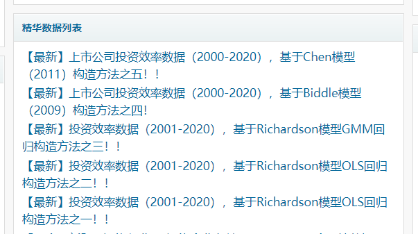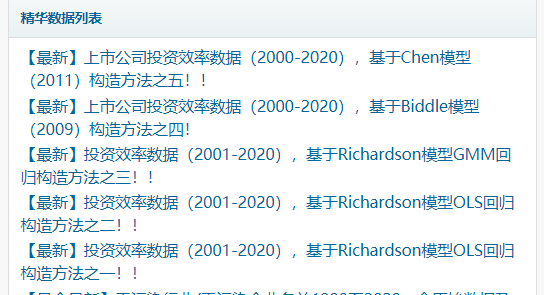 1.关于投资效率的计算,已有文献有五种方法,若大家需要进一步稳健性检验,可下载其他方法构造的投资效率数据。其他投资效率数据方法的构造见链接https://bbs.pinggu.org/home.php?mod=space&uid=10611422。打开此链接,在“精华数据列表”中查找“投资效率数据”。