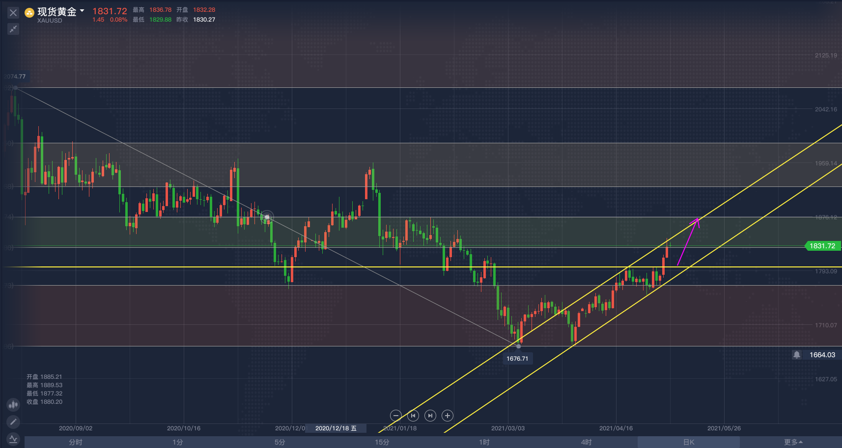 黄金经过长时间的酝酿,终于在第6次上周四上攻突破关键强阻1798,而后行情加速上涨进入千八时代,上周五借势非农一飞冲天。在技术面和基本面都看好的背景下,后市多头趋势在持续性上应该是比较持久的。从日线空间上来看,上方至少是要去测试一下1875区域阻力的。