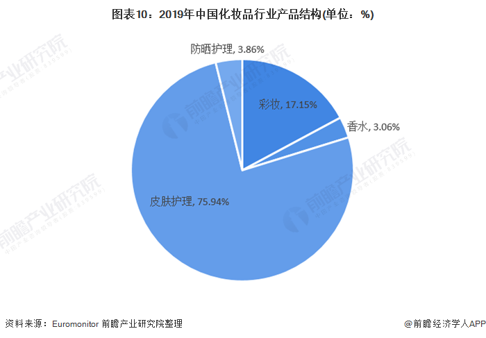 2019年在我国化妆品产业结构中,皮肤护理占据了较大的份额,为75.94%;其次是彩妆产品以占总销售额17.15%的比例排名第二;防晒护理和香水分别占我国化妆品行业总销售额的3.86%和3.06%。