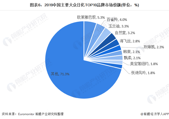 中国大众日化市场以欧美品牌、本土品牌和韩国品牌为主。2019年中国大众日化产品品牌欧莱雅巴黎以5.3%的市场份额排第一位;我国本土品牌百雀羚以4.0%的市场份额排第二位;玉兰油以3.3%的市场份额排第三位。