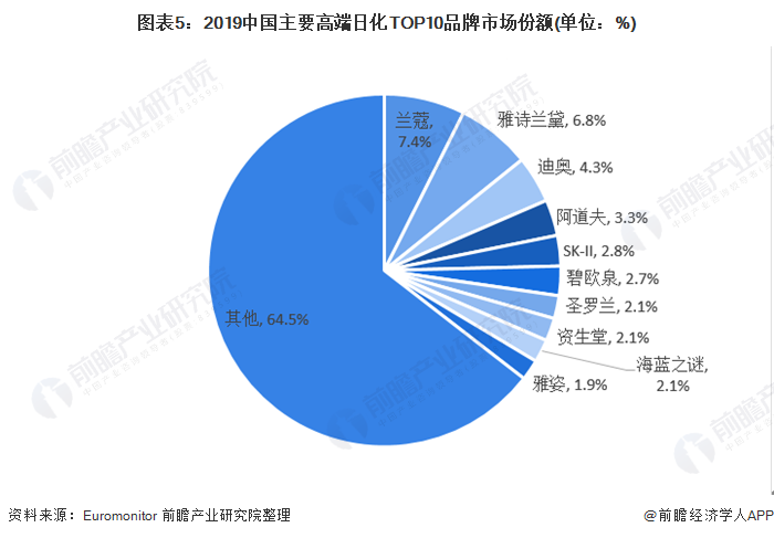 我国高端日化产品品牌主要以欧美大牌为主要产品,其中欧莱雅旗下的兰蔻以7.4%的市场份额排第一位;其次是雅诗兰黛旗下的额雅诗兰黛品牌以6.8%的市场份额排第二;迪奥以4.3%的市场份额排第三。