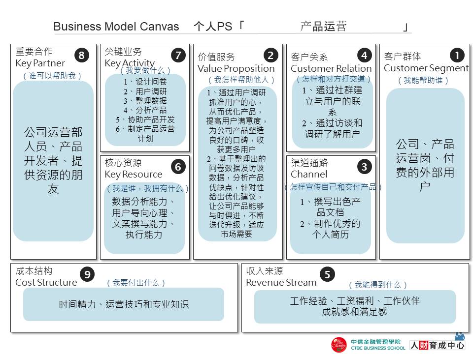 - [个人PS-商业模式画布中的业务]解释的是“我要做什么” 主要围绕目标岗位的JD动词展开说明,比如设计问卷、用户调研、整理数据、分析产品、协助产品开发、制定产品运营计划