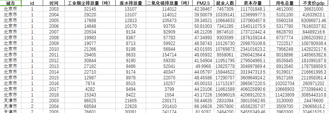 全国285个地级市全要素生产率原始数据(2003年-2018年)包括工业烟尘排放量、废水排放量、二氧化硫排放量、PM2.5、就业人数、资本存量、用电总量、不变价GDP