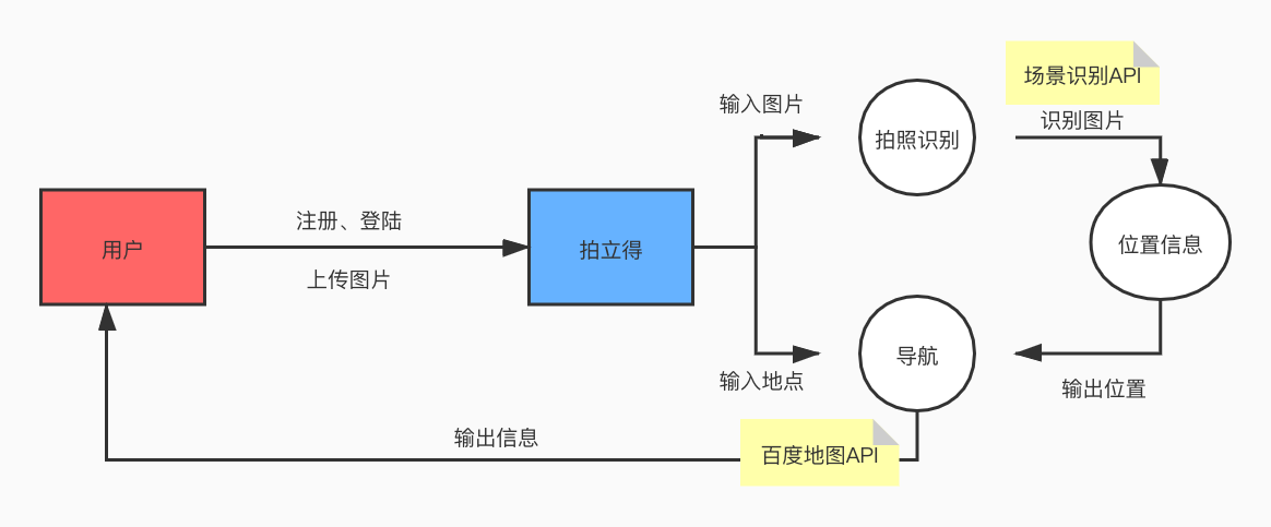 拍立得APP就是针对这一功能而研发的产品,用户可以拍摄或上传一张图片,从而得到一个地理信息。拍照—->得到位置,拍立得由此而来。本产品整合了百度地图API、场景识别API,这些技术能够帮助用户在陌生的地方更加方便快捷找到目标,在帮助用户节约时间的同时,也能够规划出最佳环保路线,系统会自动选择绿色出行方式,在提高效率的同时也对环境做出贡献。 另外,用户上传的复杂图片/不在数据库内的图片也将被
