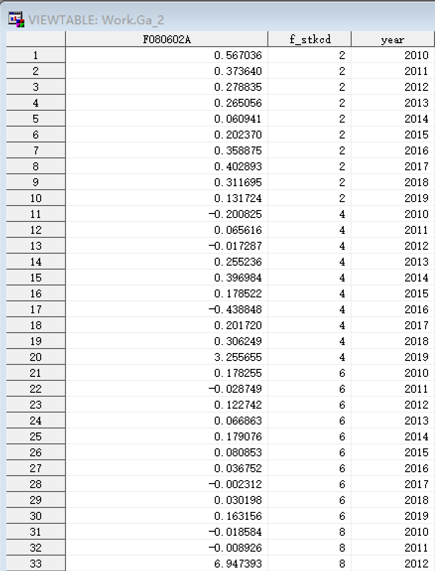SAS中遇到一个困难,就是滚动求均值、求方差不知道怎么做,求教大神指导!图一是:按f_stkcd求第一个变量前三年滚动均值,后面结果从2013年开始输出前三年的(2013、2012、2011)均值,2014就输出(2014、2013、2012)三年的均值,滚动计算。