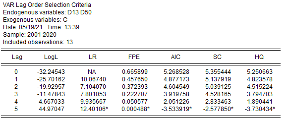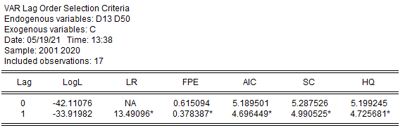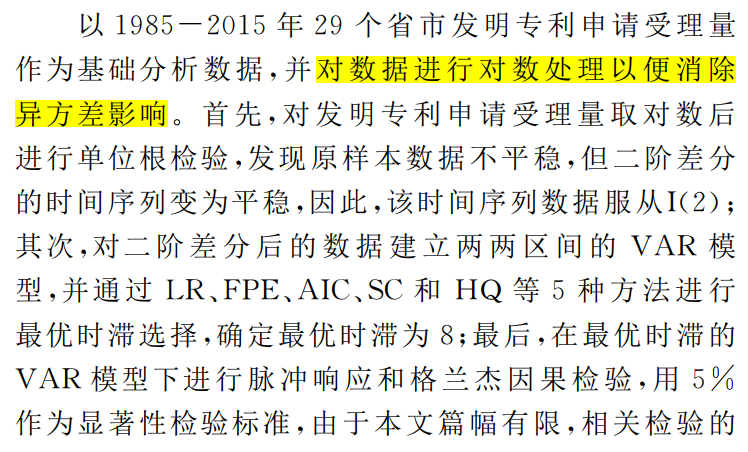 大神们好,我以我国大陆地区的31个省份2001-2020年专利申请量的时间序列为基础,准备对任意两个省份的时间序列建立VAR模型,进一步进行格兰杰因果检验,来初步判断省份创新产出间的影响(大概和下图差不多)。 已经对全部的时间序列进行了单位根检验,确定为二阶单整,并且对所有的序列做了差分。然后开始两两建立VAR模型,但是在最优时滞选择时遇到了问题。如图,选取1阶、3阶、4阶、5阶时,都能满足5种方法。请问这种时候应该怎么处理呢?
