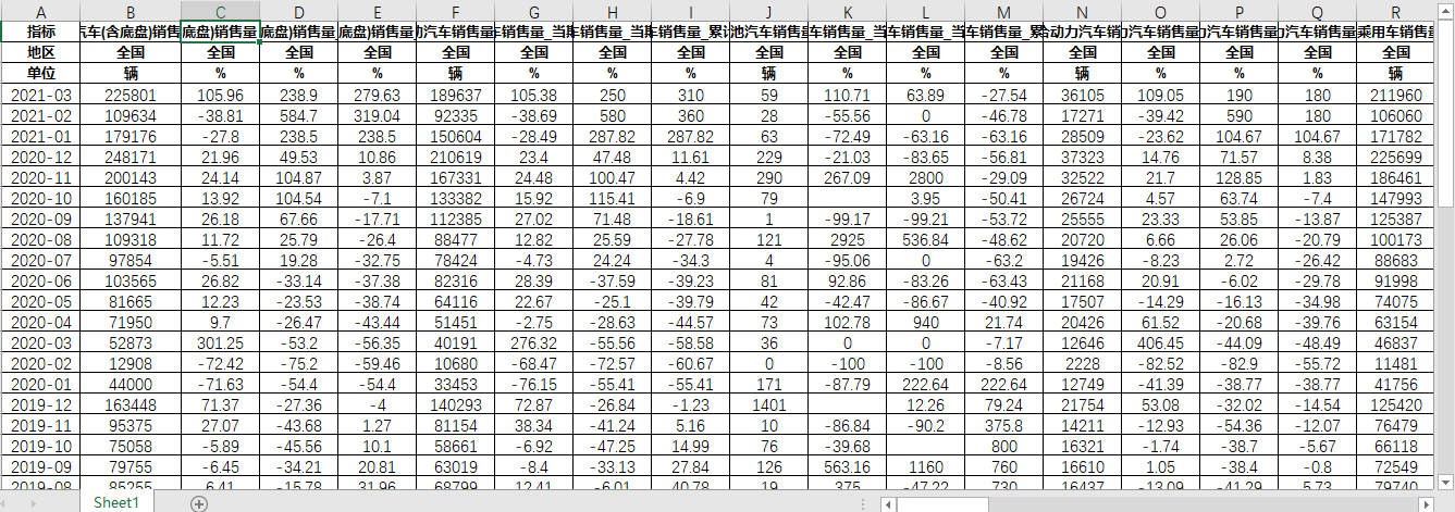 4、指标说明: 该份数据包含如下指标: 新能源汽车(含底盘)销售量_当期、新能源汽车(含底盘)销售量_当期环比增速、新能源汽车(含底盘)销售量_当期同比增速、新能源汽车(含底盘)销售量_累计同比增速、纯电动汽车销售量_当期、纯电动汽车销售量_当期环比增速、纯电动汽车销售量_当期同比增速、纯电动汽车销售量_累计同比增速、燃料电池汽车销售量_当期、燃料电池汽车销售量_当期环比增速、燃料电池汽车销售量_当期同比增速、燃料电池汽车销售量_累计同比增速、插电式混合动力汽车销售量_当期、插电式混合动力汽车销售量_当期环比增速、插电式混合动力汽车销售量_当期同比增速、插电式混合动力汽车销售量_累计同比增速、新能源乘用车销售量_当期、新能源乘用车销售量_当期环比增速、新能源乘用车销售量_当期同比增速、新能源乘用车销售量_累计同比增速、纯电动乘用车销售量_当期、纯电动乘用车销售量_当期环比增速、纯电动乘用车销售量_当期同比增速、纯电动乘用车销售量_累计同比增速、插电式混合动力乘用车销售量_当期、插电式混合动力乘用车销售量_当期环比增速、插电式混合动力乘用车销售量_当期同比增速、插电式混合动力乘用车销售量_累计同比增速、新能源基本型乘用车(轿车)销售量_当期、新能源基本型乘用车(轿车)销售量_当期环比增速、新能源基本型乘用车(轿车)销售量_当期同比增速、新能源基本型乘用车(轿车)销售量_累计同比增速、纯电动基本型乘用车(轿车)销售量_当期、纯电动基本型乘用车(轿车)销售量_当期环比增速、纯电动基本型乘用车(轿车)销售量_当期同比增速、纯电动基本型乘用车(轿车)销售量_累计同比增速、插电式混合动力基本型乘用车(轿车)销售量_当期、插电式混合动力基本型乘用车(轿车)销售量_当期环比增速、插电式混合动力基本型乘用车(轿车)销售量_当期同比增速、插电式混合动力基本型乘用车(轿车)销售量_累计同比增速、新能源其他乘用车(除轿车)销售量_当期、新能源其他乘用车(除轿车)销售量_当期环比增速、新能源其他乘用车(除轿车)销售量_当期同比增速、新能源其他乘用车(除轿车)销售量_累计同比增速、纯电动其他乘用车(除轿车)销售量_当期、纯电动其他乘用车(除轿车)销售量_当期环比增速、纯电动其他乘用车(除轿车)销售量_当期同比增速、纯电动其他乘用车(除轿车)销售量_累计同比增速、插电式混合动力其他乘用车(除轿车)销售量_当期、插电式混合动力其他乘用车(除轿车)销售量_当期环比增速、插电式混合动力其他乘用车(除轿车)销售量_当期同比增速、插电式混合动力其他乘用车(除轿车)销售量_累计同比增速、新能源商用车销售量_当期环比增速、新能源商用车销售量_当期同比增速、新能源商用车销售量_累计同比增速、纯电动商用车销售量_当期环比增速、纯电动商用车销售量_当期同比增速、纯电动商用车销售量_累计同比增速、燃料电池商用车销售量_当期环比增速、燃料电池商用车销售量_当期同比增速、燃料电池商用车销售量_累计同比增速、插电式混合动力商用车销售量_当期、插电式混合动力商用车销售量_当期环比增速、插电式混合动力商用车销售量_当期同比增速、插电式混合动力商用车销售量_累计同比增速、新能源客车销售量_当期、新能源客车销售量_当期环比增速、新能源客车销售量_当期同比增速、新能源客车销售量_累计同比增速、纯电动客车销售量_当期、纯电动客车销售量_当期环比增速、纯电动客车销售量_当期同比增速、纯电动客车销售量_累计同比增速、纯电动城市客车销售量_当期、纯电动城市客车销售量_当期环比增速、纯电动城市客车销售量_当期同比增速、纯电动城市客车销售量_累计同比增速、燃料电池客车销售量_当期、燃料电池客车销售量_当期环比增速、燃料电池客车销售量_当期同比增速、燃料电池客车销售量_累计同比增速、燃料电池城市客车销售量_当期、燃料电池城市客车销售量_当期环比增速、插电式混合动力客车销售量_当期、插电式混合动力客车销售量_当期环比增速、插电式混合动力客车销售量_当期同比增速、插电式混合动力客车销售量_累计同比增速、插电式混合动力城市客车销售量_当期、插电式混合动力城市客车销售量_当期环比增速、插电式混合动力城市客车销售量_当期同比增速、插电式混合动力城市客车销售量_累计同比增速、新能源货车销售量_当期环比增速、新能源货车销售量_当期同比增速、新能源货车销售量_累计同比增速、纯电动货车销售量_当期环比增速、纯电动货车销售量_当期同比增速、纯电动货车销售量_累计同比增速、纯电动专用货车销售量_当期环比增速、纯电动专用货车销售量_当期同比增速、纯电动专用货车销售量_累计同比增速