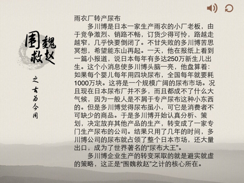 另外,整套《商战三十六计》均有专业配音(包括故事部分和案例部分),我们常常是把朗读打开,一边欣赏并观察画面上的人物关系一边收听故事。不过,故事部分没有自动播放功能,所以需要手动翻页才能继续朗读。我们认为自动播放还是有必要的,因为画面本身没有互动,只是帮助理解文字,所以随着朗读不断播放画面会比较符合收听和阅读习惯。