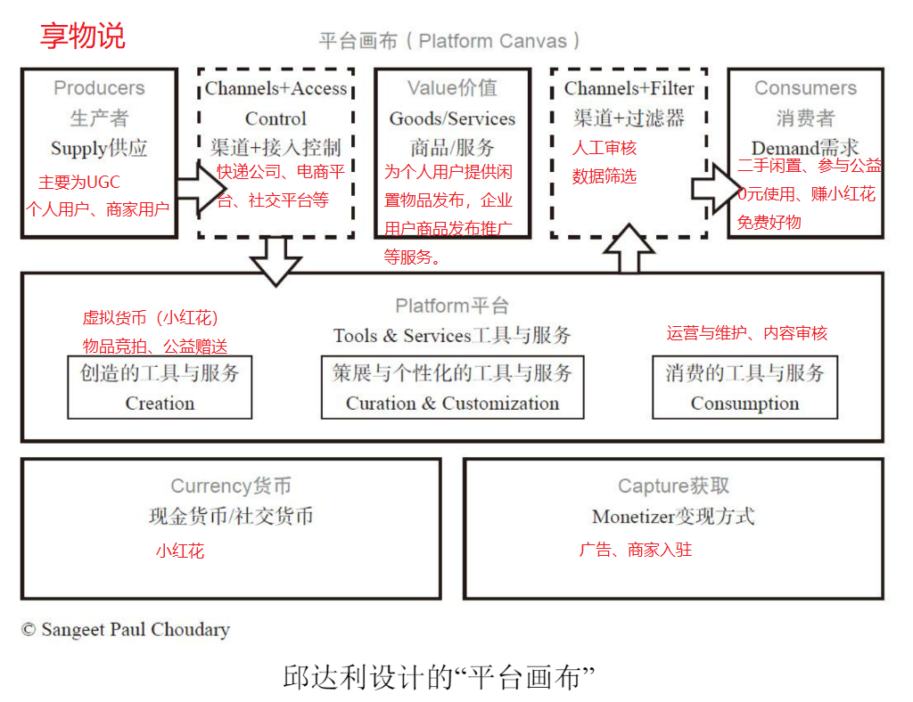 根据邱达利平台画布,享物说是主要为个人用户提供闲置物品发布,企业用户商品发布推广等服务。在享物说上,赠予方可上传自己的闲置品;接收方用红花拍下物品后,等待快递送上门即可;赠予方可收到接收方发来的感谢视频;赠予方成功送出物品后,可获得长期有效的积分“小红花”,可兑换自己心仪的物品;领取平台合作商家提供的低价好物。其中最大特点就是作虚拟货币的小红花并不与法币挂钩,且物品赠送后获得精神满足大大留住了用户。